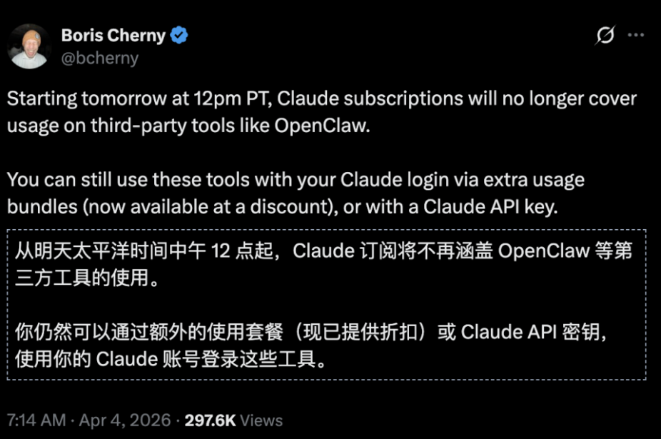 2026年4月4日,美国大模型头部公司Anthropic旗下AI 编程工具Claude Code负责人Boris Cherny发文称,美国西部时间4月4日中午12点起,Claude订阅服务将不再包含对Open Claw等第三方工具的使用额度。