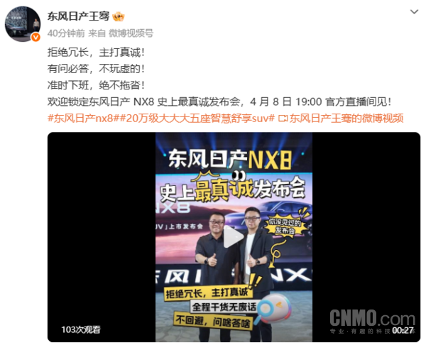 4月7日,东风日产新能源总经理王骞通过社交媒体发布视频,预告将于4月8日晚7点举行的NX8上市发布会。视频中,王骞明确表示,此次发布会将“拒绝冗长,主打真诚”“有问必答,不玩虚的”,并承诺“准时下班,绝不拖沓”。