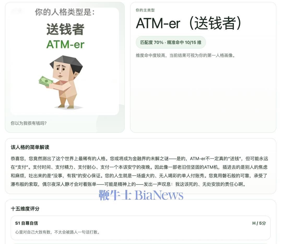 送钱者的描述为:“恭喜您,您竟然测出了这个世界上最稀有的人格。您或将成为金融界的未解之谜-是的,ATM-er不一定真的“送钱”,但可能永远在“支付”。支付时间、支付精力、支付耐心、支付一个本该安宁的夜晚。因此像一部老旧但坚固的ATM机,插进去的是别人的焦虑和麻烦,吐出来的是“没事,有我的安心保证。”