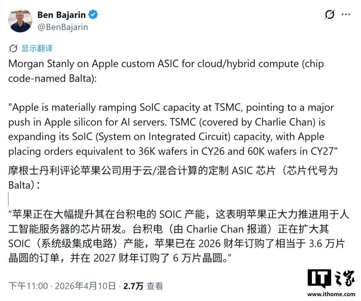IT之家 4 月 11 日消息,摩根士丹利分析师最新研报指出,苹果公司大幅扩充台积电 SoIC(系统集成芯片)封装产能预订,2026 年预订 3.6 万片晶圆,2027 年增至 6 万片。