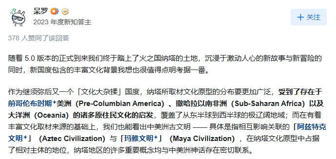 玩家们也乐于讨论纳塔背后的文化参考,一名知乎用户就认为纳塔“受到了阿兹特克文明与玛雅文明的启发,地貌设计、地理名称等都相当考究”。