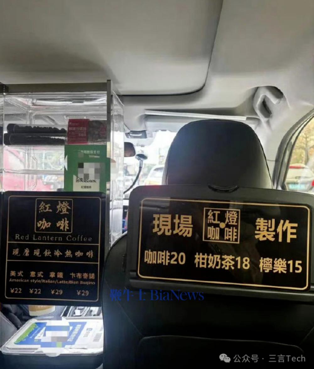 近日,有网友在社交平台晒出自己打到的咖啡网约车,图片中,司机将副驾驶位改造成移动咖啡吧台,并配备咖啡机张贴“红灯咖啡”价目表,主打“现磨现饮”。饮品包括美式/意式(22元)、拿铁/卡布奇诺(29元)及柠乐等饮料(超15元)。