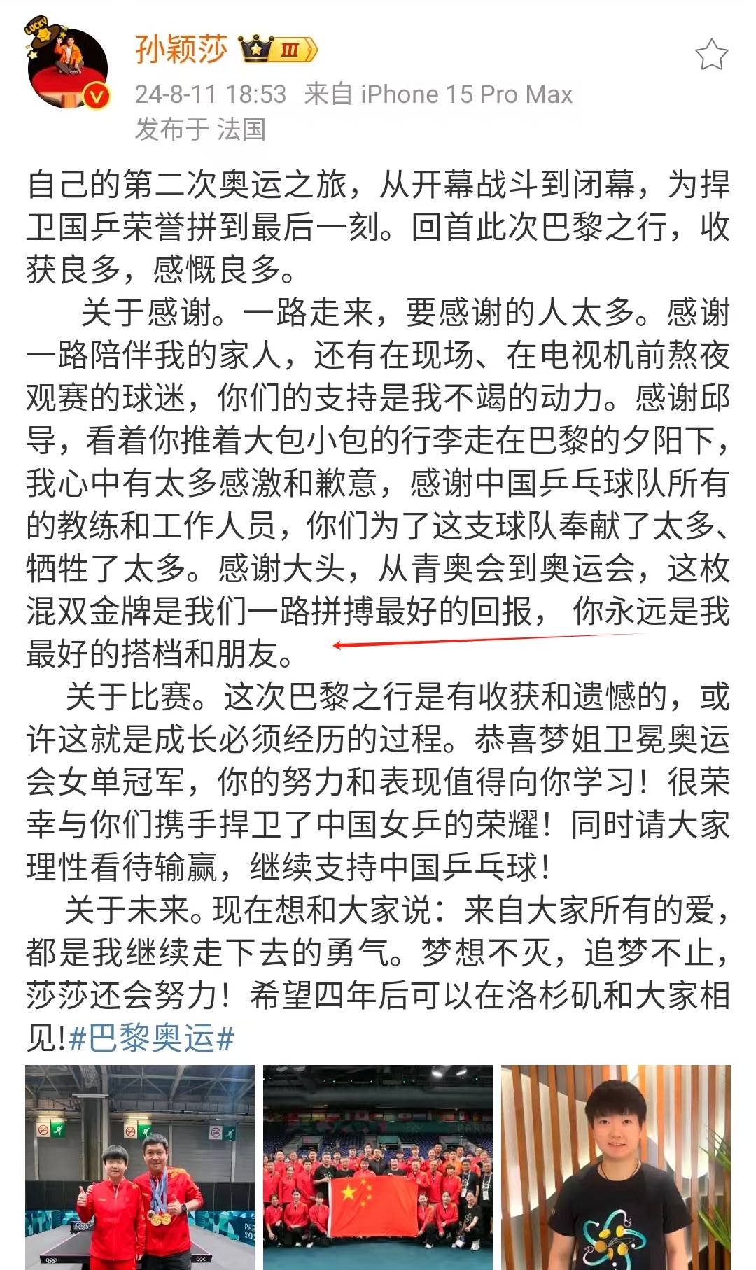 在这个过程中,孙颖莎和王楚钦的默契自然是不用多说,因为两者是混双的搭档,可是在过程中,当场面上出现有趣的画面,孙颖莎耿直毫无收敛的大笑,孙颖莎毫无避嫌的带着看起来有点内向的大头一起投入到互动中,讲真的,如果两者是情侣的话,在这样的高关注度之下,孙颖莎一定会注意自己的动作和举动,而孙颖莎的身体动作也告诉我们两者的关系应该是好朋友、好搭档,也因为如此,孙颖莎的动作才会如此的“放肆”和好不避嫌,事实上,在巴黎奥运会进行自我总结的时候,孙颖莎就回应过这件事情,在社交媒体上,孙颖莎表示:感谢大头,从青奥会到奥运会,这枚混双金牌是我们一路拼搏最好的回报,你永远是我最好的搭档和朋友。