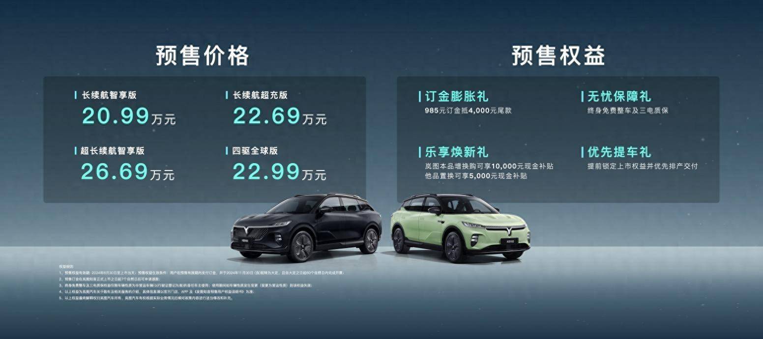 2024年8月30日岚图知音在成都车展首发亮相并开启预售,新车共发布4款车型,预售价格的区别为20.99-26.69万元。基于ESSA架构打造的紧凑型SUV,预计将于2024年第三季度上市。动力上,搭载单、双电机驱动系统,综合最大续航901km。