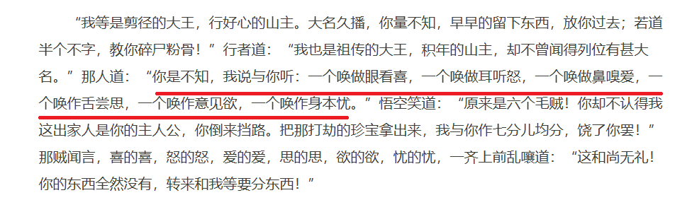 这六根的名讳,其实来源于西游记第十四回“心猿归正 六贼无踪"中,暗指孙悟空扫清六根、打杀六贼的情节,此六贼的名字正是“眼看喜”“耳听怒”“鼻嗅爱”“舌尝思”“意见欲”“身本忧”。