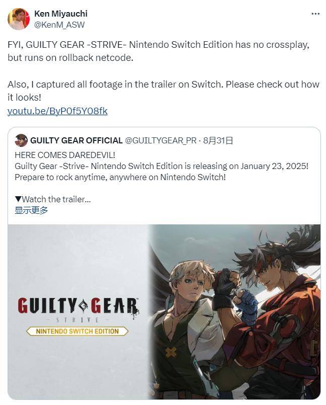 根据宫内健所透露的消息,《罪恶装备:Strive》Switch版本将无法支持跨平台联机功能,也就是说,玩家们不能在Switch、PlayStation、Xbox和PC这四个平台上进行跨平台的对战。不过好在该版本加入了一项回滚网络代码功能,这样一来,玩家们就能够获得相对流畅的在线游戏体验。