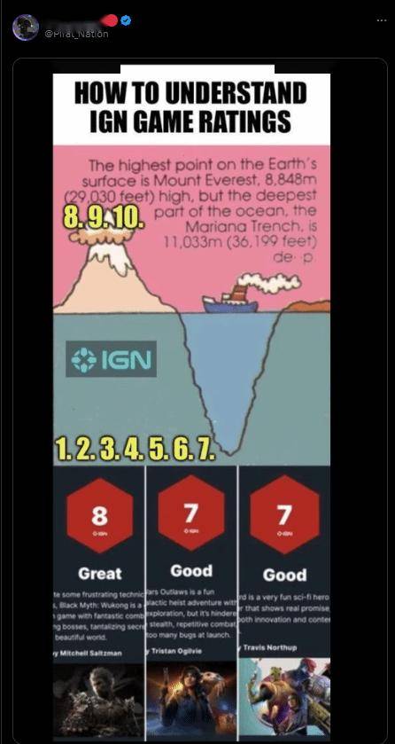 有网友指出,近年获得了IGN 7分的作品,如《剑星》《如龙外传》甚至《星空》的表现都要明显优于上述作品,不应该被相提并论。于是就有网友制作了梗图讽刺IGN的打分:看似只有一分之差,但实际千差万别,达到8分就已是巅峰之作了。