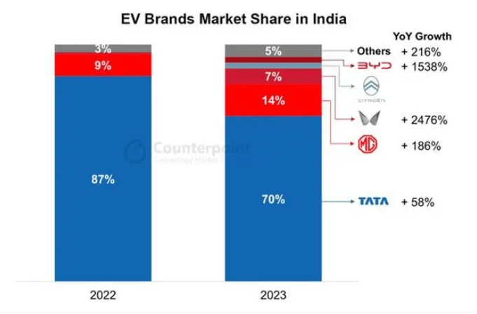 印度汽车经销商协会数据,该国2023财年(2023年4月1日至2024年3月31日)电动汽车销量约为9万辆,同比增长近一倍。咨询公司Counterpoint Research统计,预计2024财年的销量增长或将达到66%,占据乘用车总销量的4%。