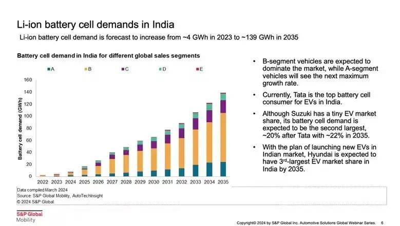 这一计划,或将影响塔塔在电动车赛道的领军地位。标普全球汽车(S&P Global Mobility)数据预计,2035年马鲁蒂铃木将推动印度20%的电池需求,仅次于塔塔汽车的22%,两家公司基本上能在十年后打成平手。