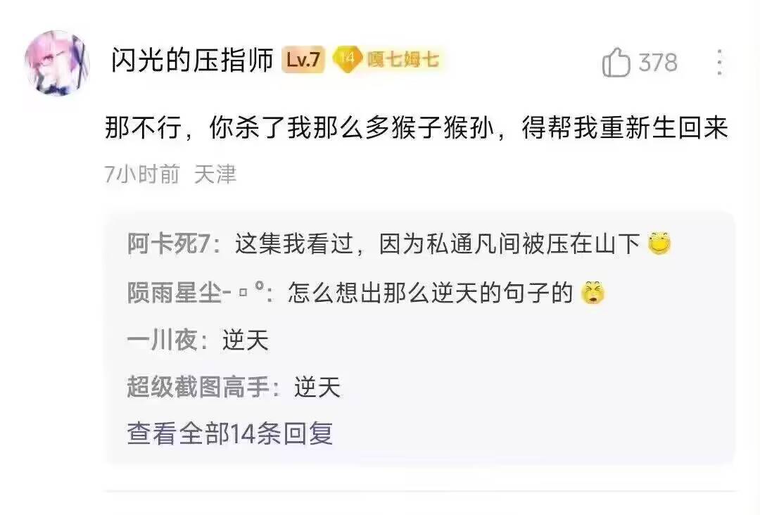 不过,玩笑归玩笑,别忘了大伙如今的欢乐源泉是二郎神和齐天大圣这样的神仙,所以自然不缺所谓的原著党出言进行讨伐,以及“改编不是乱编,戏说不是胡说”之类的评论。