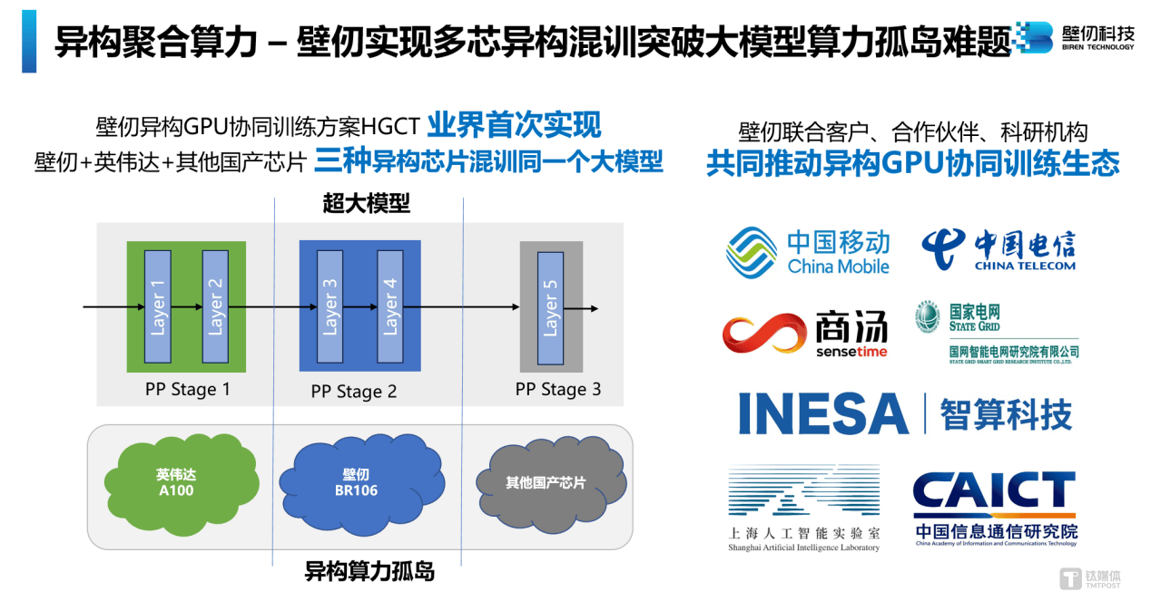 壁仞科技还透露,其正联合客户、合作伙伴、科研机构共同推动异构GPU协同训练生态,具体包括:中国移动、中国电信、商汤科技、国网智能电网研究院有限公司、上海智能算力科技有限公司、上海人工智能实验室、中国信息通信研究院等。