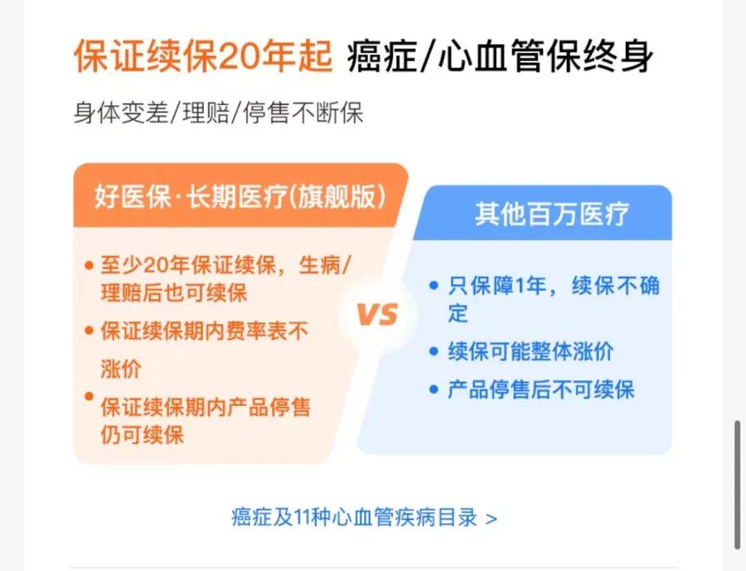 “好医保·长期医疗”系列,从2018年保证续保6年的首款产品,到保证续保20年的好医保·长期医疗险(20年版),再到2023年主打0免赔额的好医保·长期医疗(0免赔),在今年,它再次推陈出新,发布了保证癌症及11种心血管病终身续保、并且兼顾了0免赔额的好医保·长期医疗(旗舰版)。