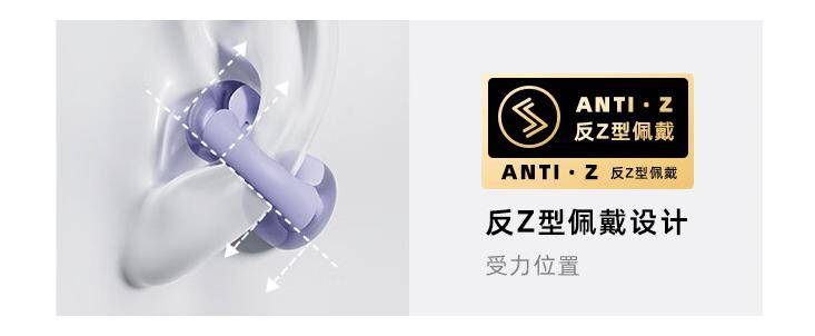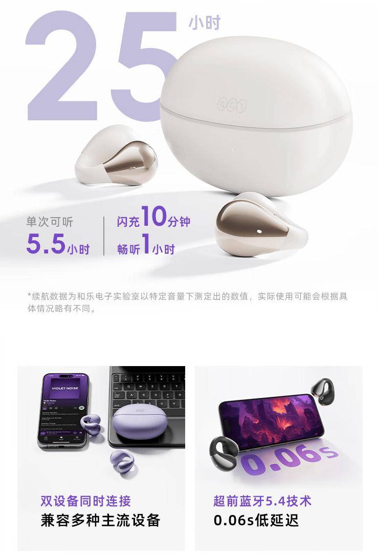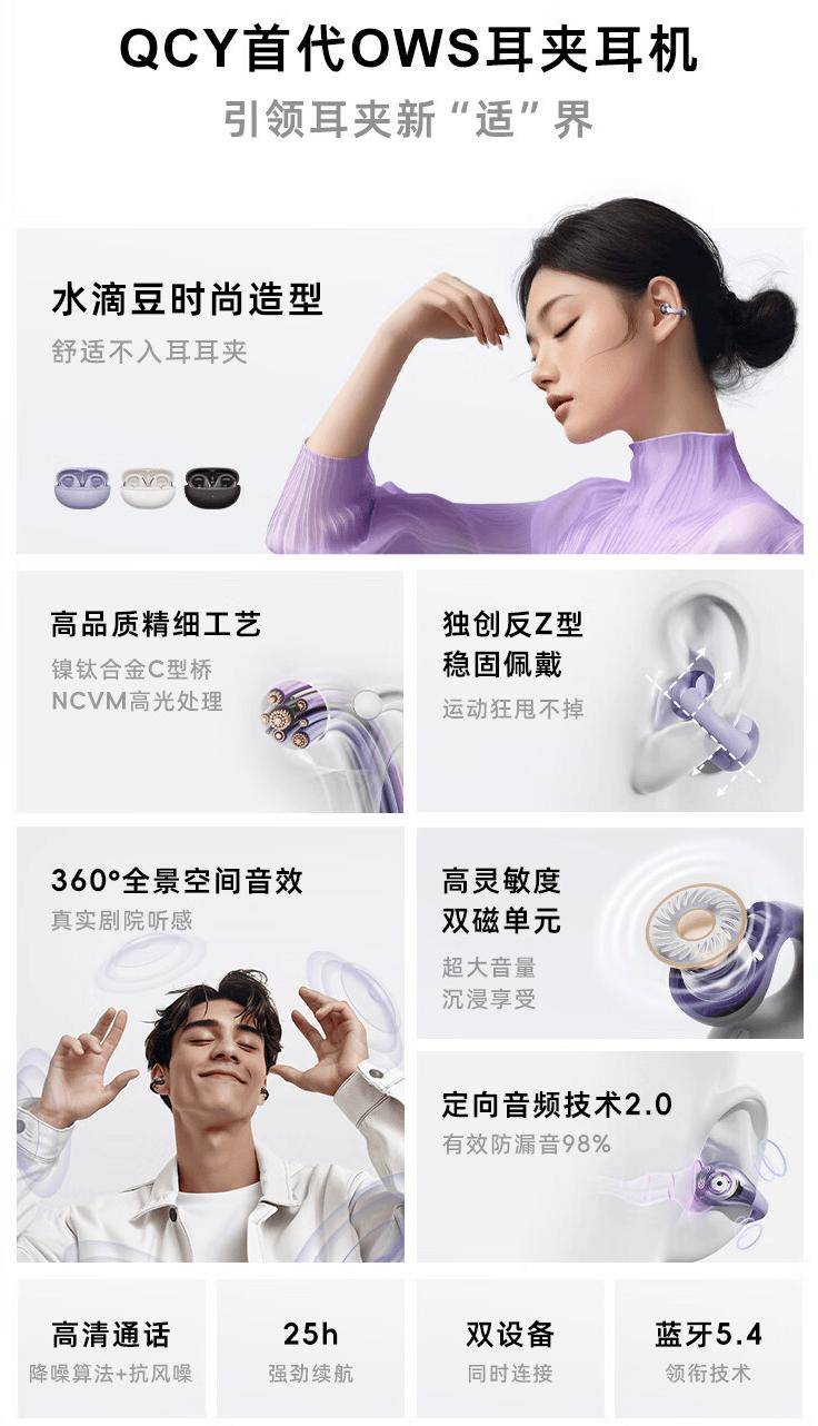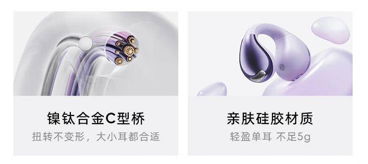 QCY Crossky C30 开放式耳机采用水滴豆造型设计,拥有紫、白、黑三种配色,采用镍钛合金 C 型桥,辅以 NCVM 高光处理,独创反 Z 型造型稳定佩戴。