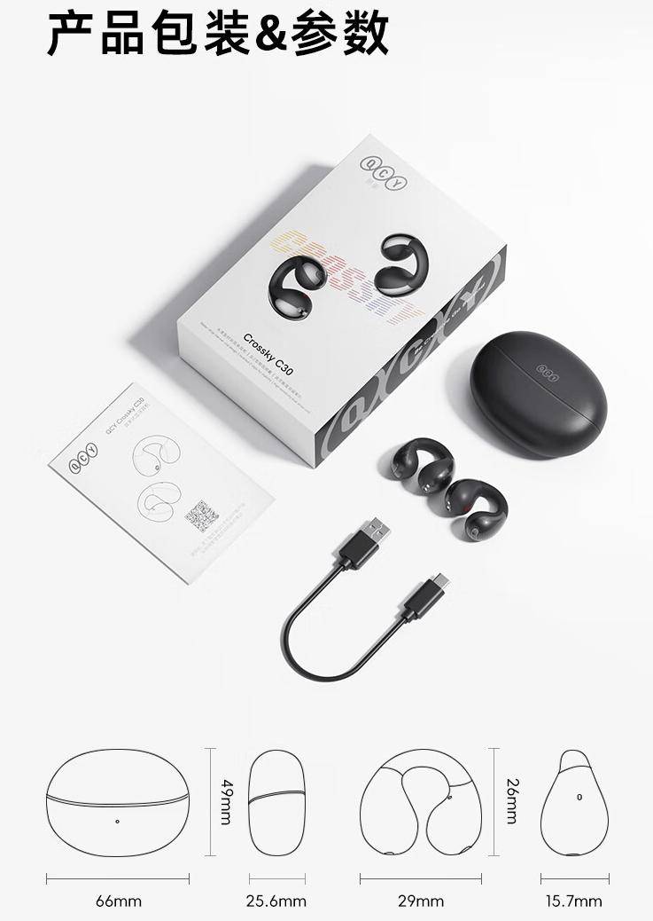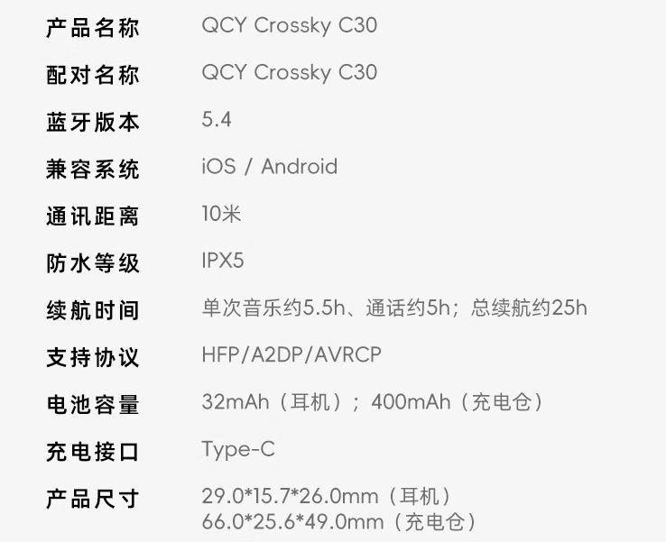 附 QCY Crossky C30 开放式耳机亮点及产品参数如下: