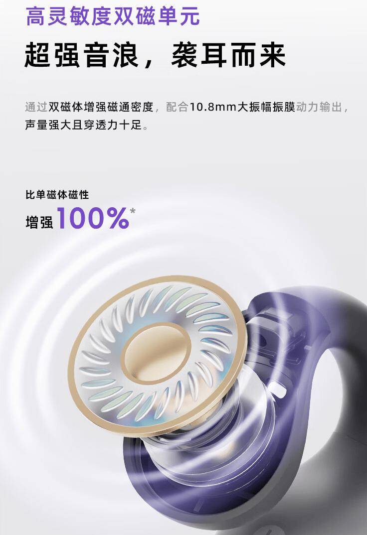 该耳机配备双磁单元+10.8mm 振膜,采用蓝牙 5.4 标准,支持双设备连接、定向音频技术 2.0、360° 空间音频;内置降噪算法,可抗风噪通话,搭配耳机盒使用,续航约 25h。