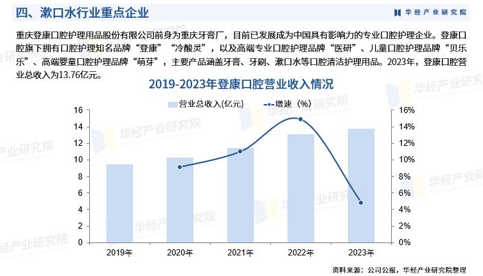 重庆登康口腔护理用品股份有限公司前身为重庆牙膏厂,目前已发展成为中国具有影响力的专业口腔护理企业。登康口腔旗下拥有口腔护理知名品牌“登康”“冷酸灵”,以及高端专业口腔护理品牌“医研”、儿童口腔护理品牌“贝乐乐”、高端婴童口腔护理品牌“萌芽”,主要产品涵盖牙膏、牙刷、漱口水等口腔清洁护理用品。2023年,登康口腔营业总收入为13.76亿元。
