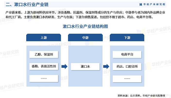 产业链来看,上游为原材料供应环节,涉及香精、抗菌剂、保湿剂等成分的生产与供应;中游参与者为国内外品牌企业和代工厂商,主要负责漱口水的研发、生产与包装;下游为销售渠道,包括但不限于超市、药店、电商平台等。