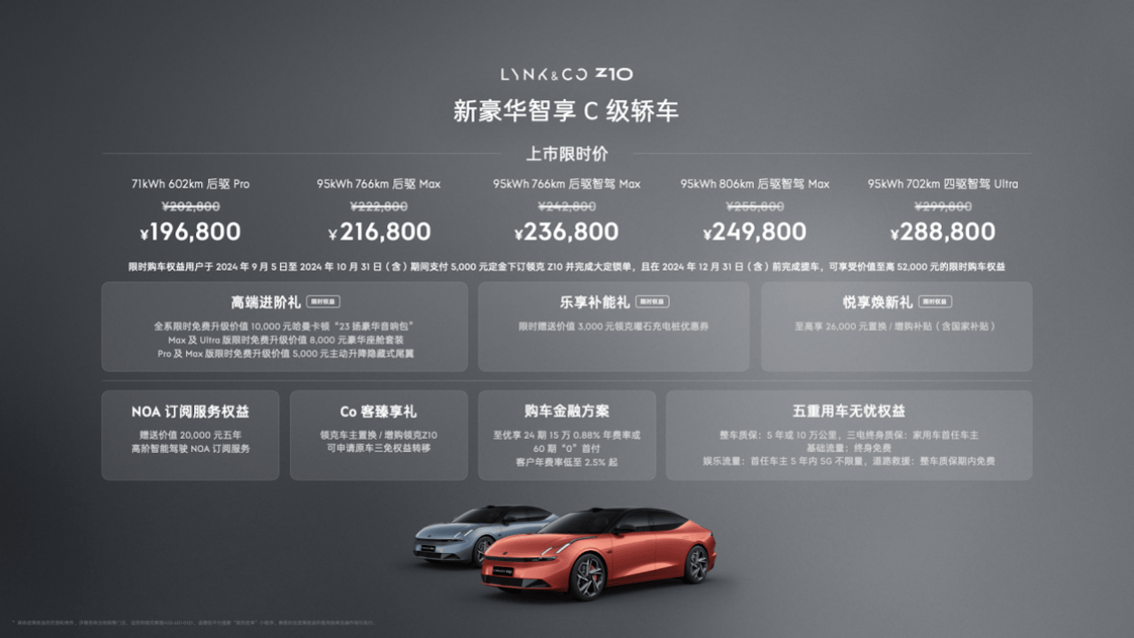 2024年9月5日,车迷们期待已久的领克Z10迎来正式上市,新车共推出5款,配置指导价格20.28~29.98万元,限时优惠价则为19.68~28.88万元。作为领克的首款纯电C级轿车,领克Z10自带一眼可辨的领克范儿,整车传承领克操控基因,而且搭载全球顶级算力车机系统与高阶智能驾驶方案,旨在为用户带来前所未有的纯电出行体验。那么接下来就让我们来具体了解一下,这一纯电C级轿车市场标杆有着怎样的表现吧?